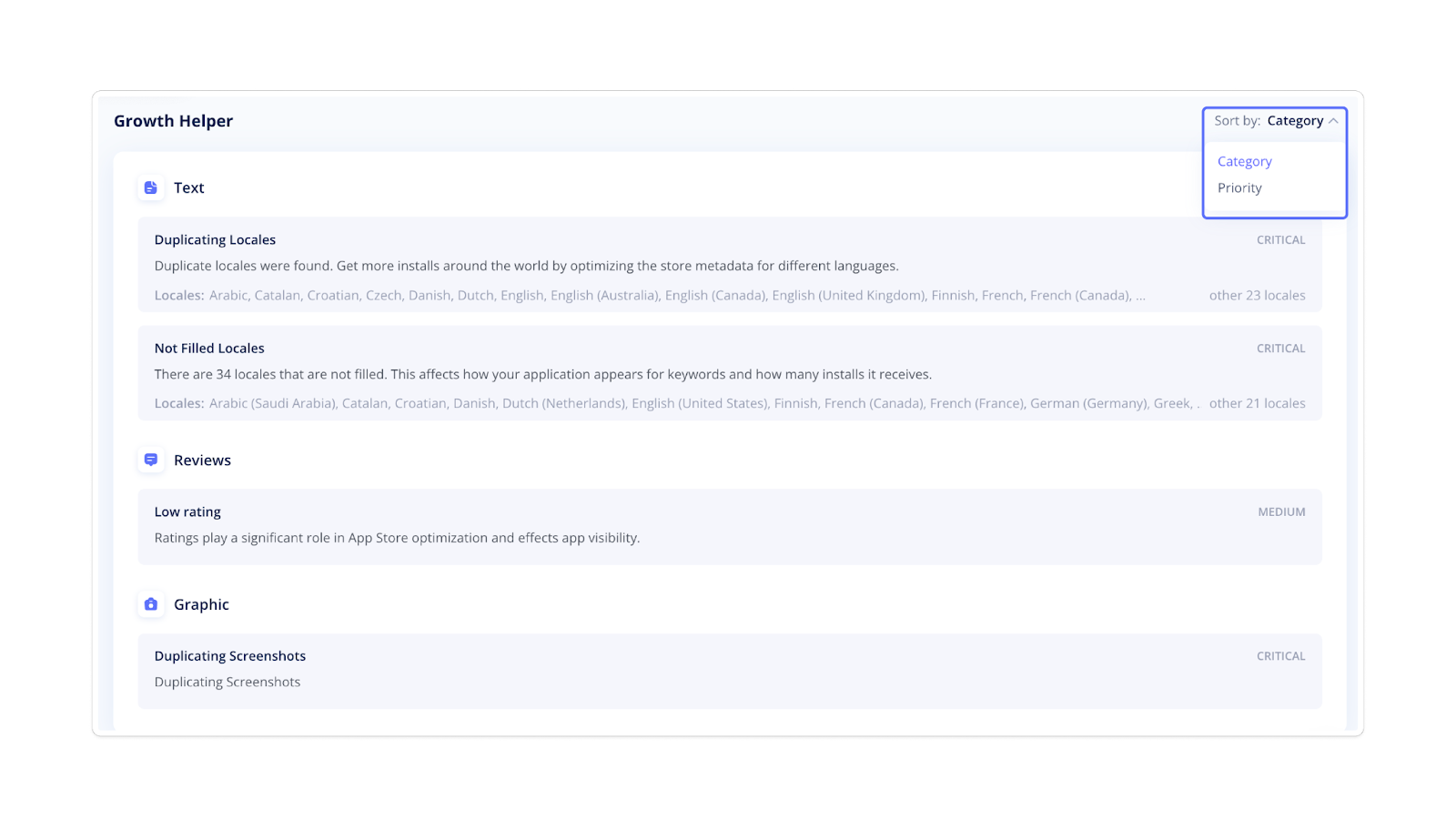 The Growth Helper automatically detects issues in your app's optimization, including text, reviews, and graphics, and highlights the locales where they occur. It also provides actionable advice on how to fix them.