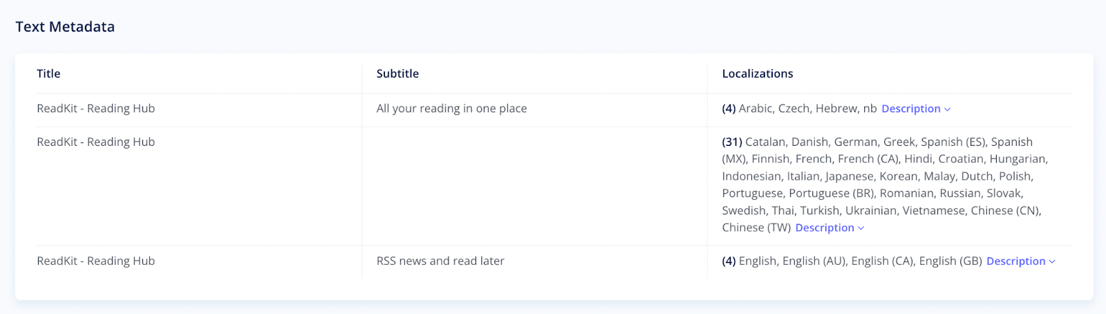 This table shows how your metadata looks across all countries and languages where your app is available. Here, you'll find: