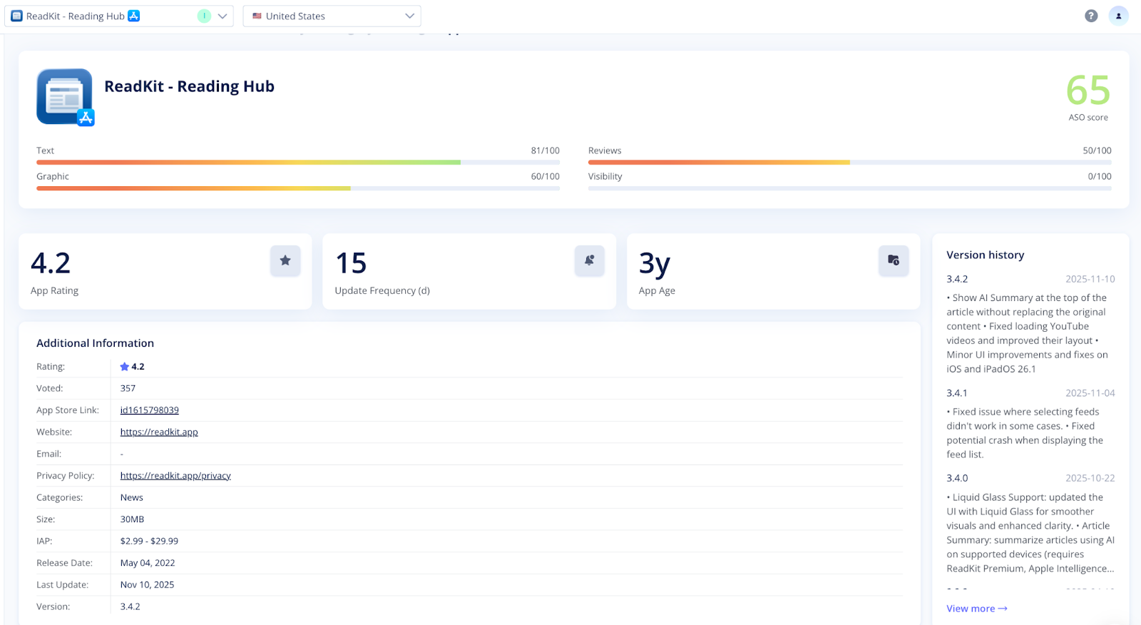 The App Info section provides key details about your app, including its rating, update frequency (in days), age, version history, and other general data from the app store page.