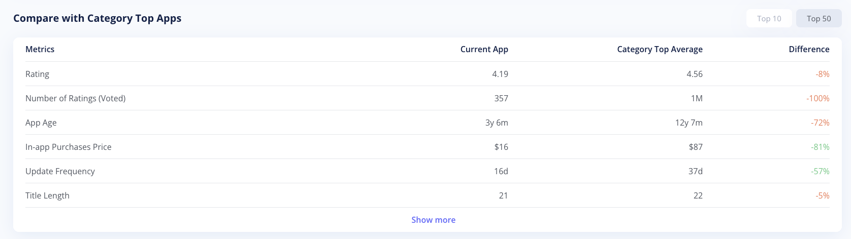 This section lets you compare ten key performance metrics of your app with the average values of the top 10 or top 50 apps in the same category. Review these comparisons to quickly assess how your app performs against leading competitors and find areas for improvement.
