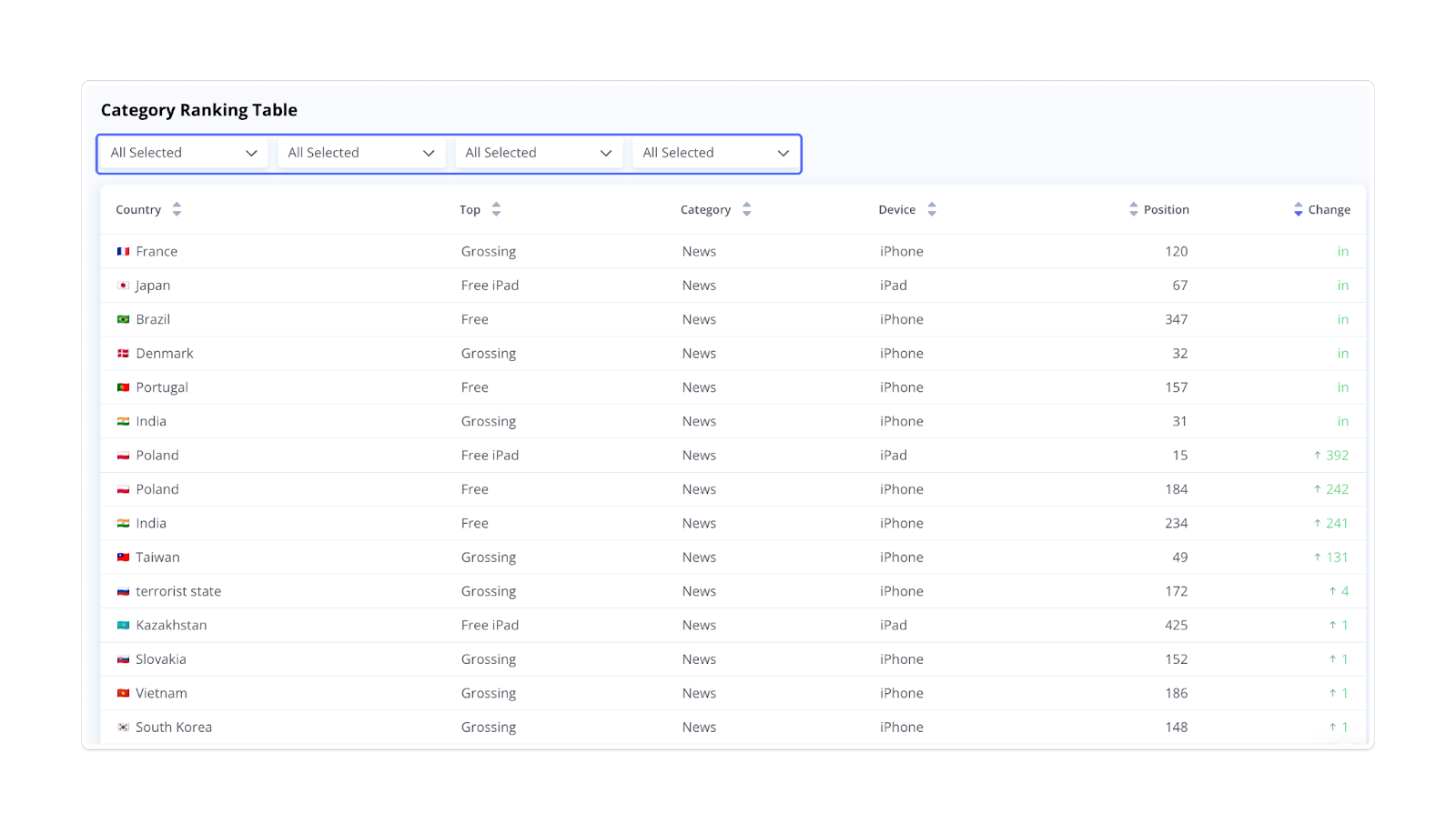 This table provides a detailed view of your app's category positions across countries and how these rankings have changed compared to the day before. Use the dropdown lists above the chart to filter data by specific countries or categories.