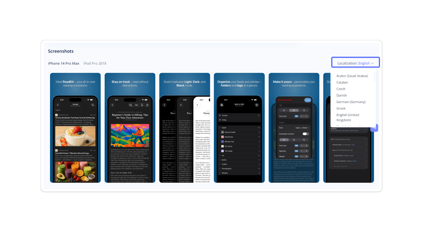 Right under the header, you can view your app's screenshots across all available localizations. On the right side, a dropdown menu lets you select a specific language or country to visually analyze how your app appears in different markets.