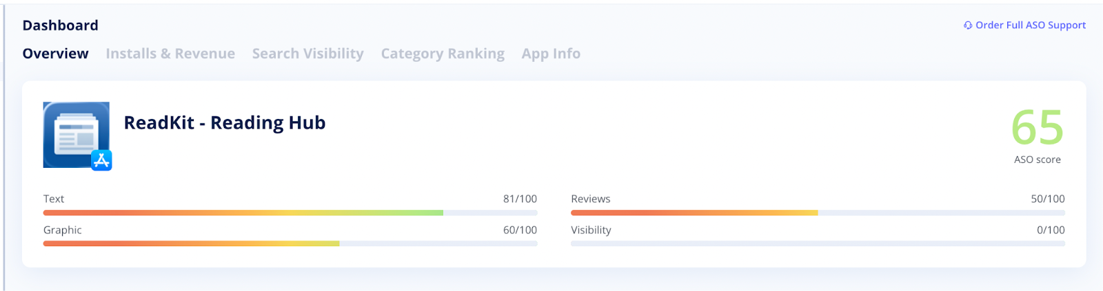 The header contains information about your current ASO score and estimation of the app's texts, graphics, reviews, and visibility effectiveness. Scores range from 0 to 100, where 100 is the strongest.
