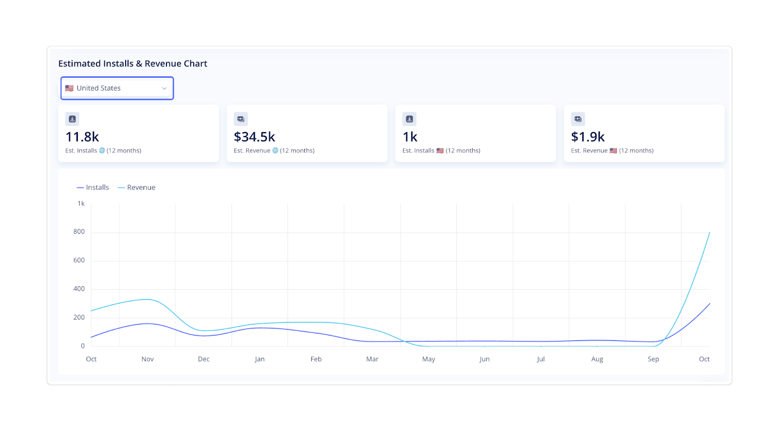 Here, you can view estimated installs and revenue over recent months for a selected country. The line chart illustrates the monthly dynamics for both metrics. Use the country dropdown menu to switch regions and analyze performance across markets.