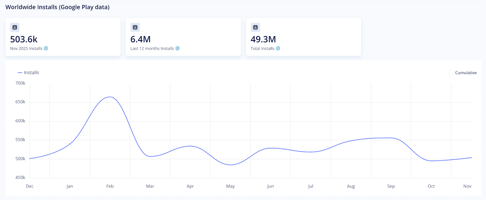 This section shows your app's total installs for the current month, the last 12 months, and overall. You'll also see a chart showing how the number changed over the year. It lets you spot growth trends, seasonal fluctuations, and potential performance drops.