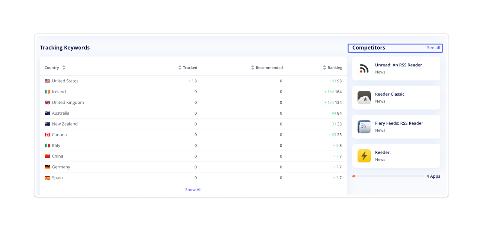 To the right of the Tracking Keywords table, you'll find a quick overview of the Competitors tool. This section displays the apps you've marked as your competitors. Click "See all" to switch to the full version of the tool.
