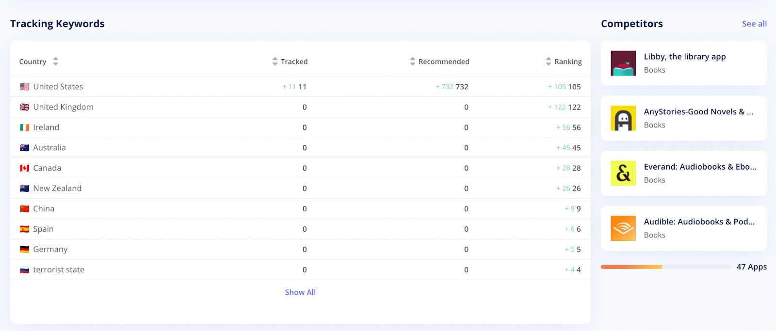 This is a quick overview of the Tracking tool data. Here you can see the number of keywords you have added to the Keywords Tracker, grouped by country, along with the total number of keywords your app is ranked for.
