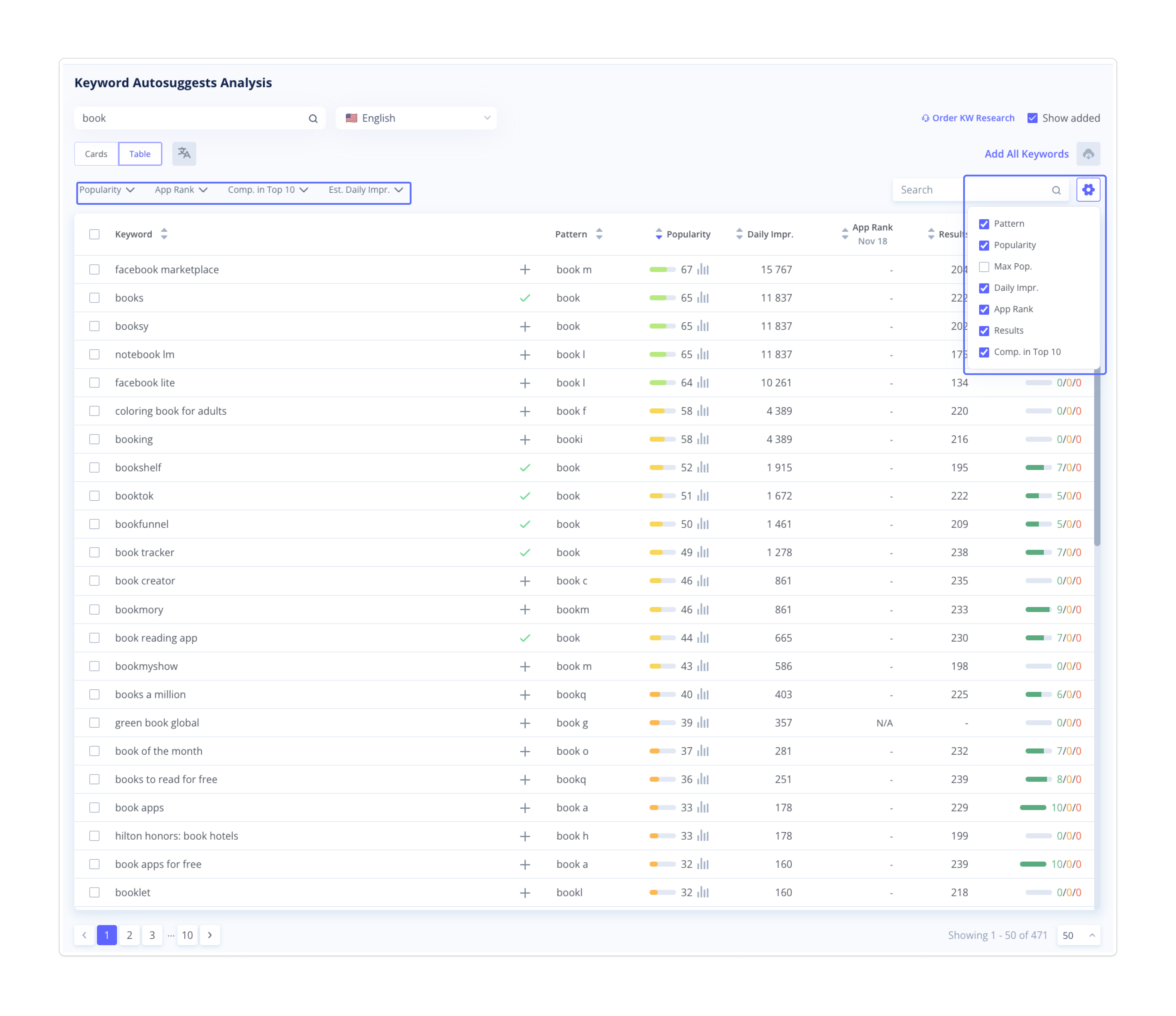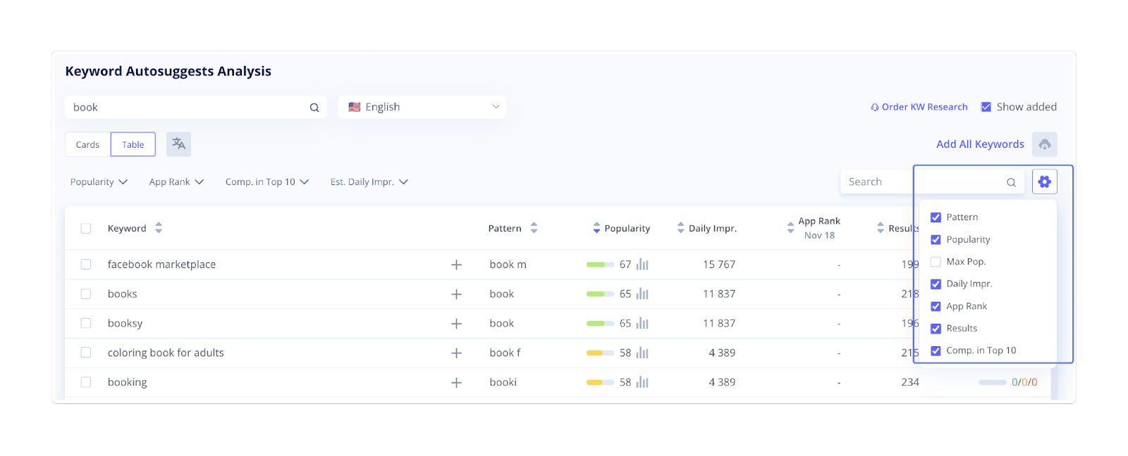 Use the gear icon in the top right corner of the table to customize which columns are displayed. You can enable or disable metrics like Popularity, App Rank, or Competition to focus on the data that matters most.
