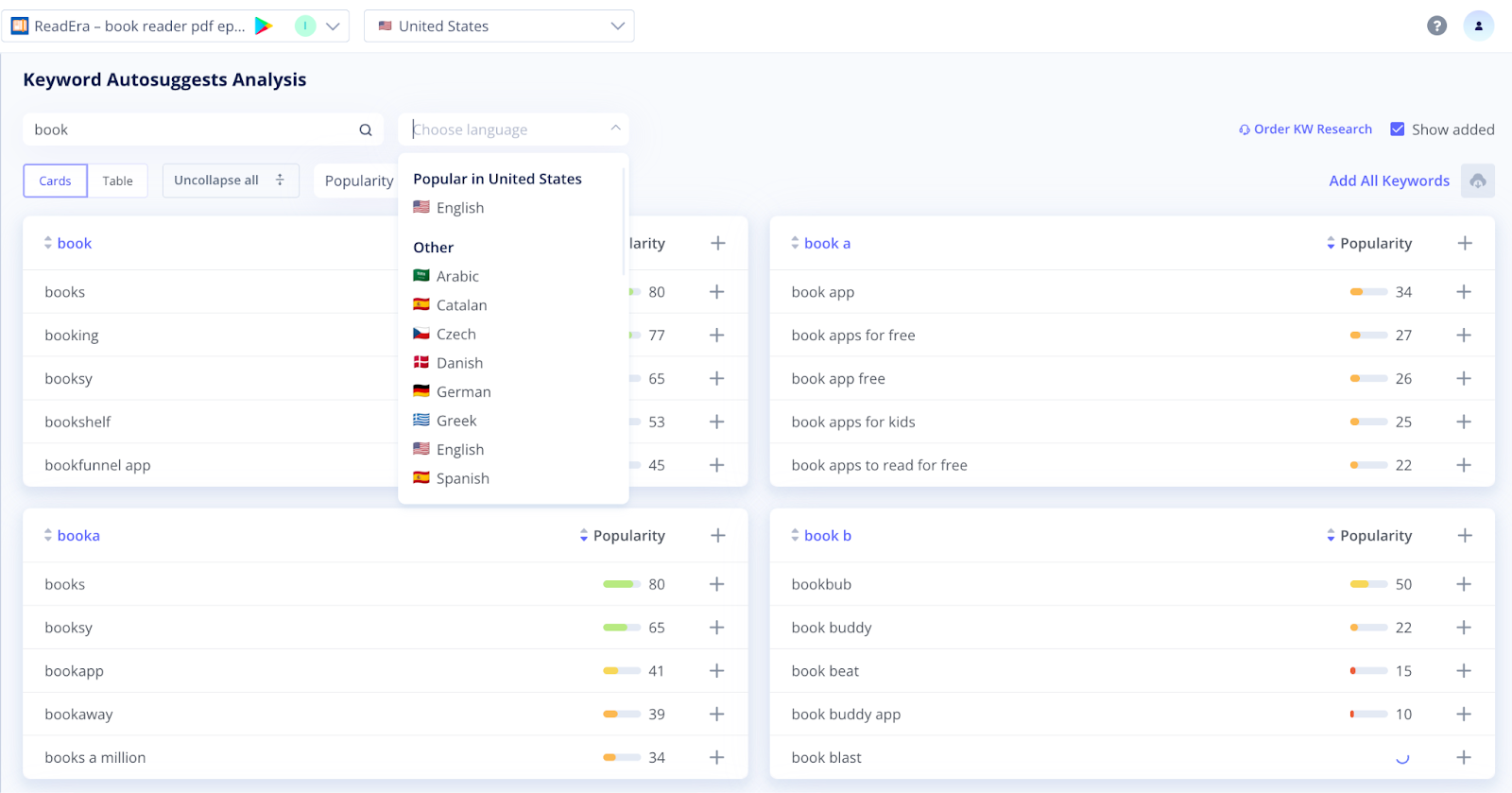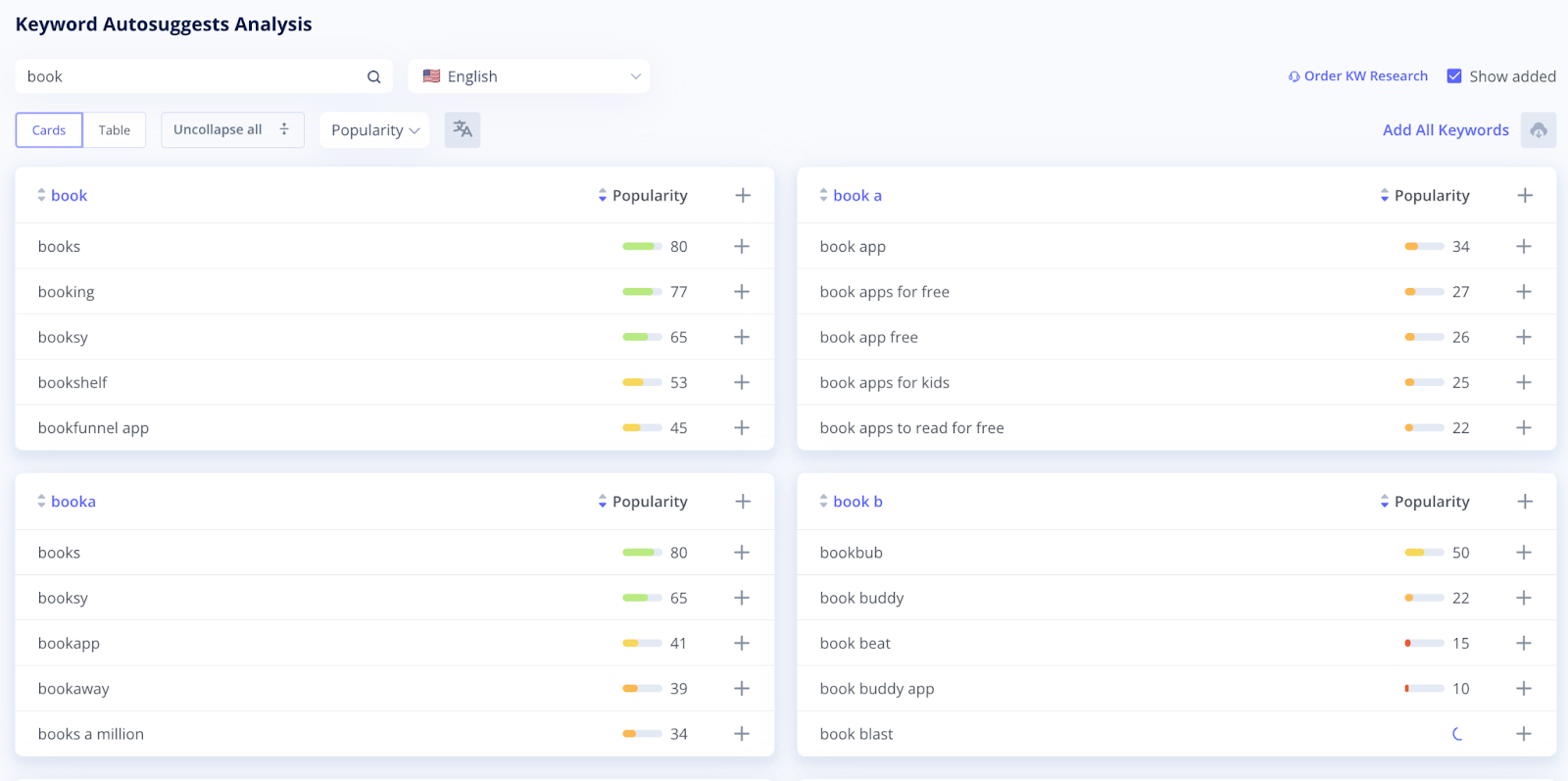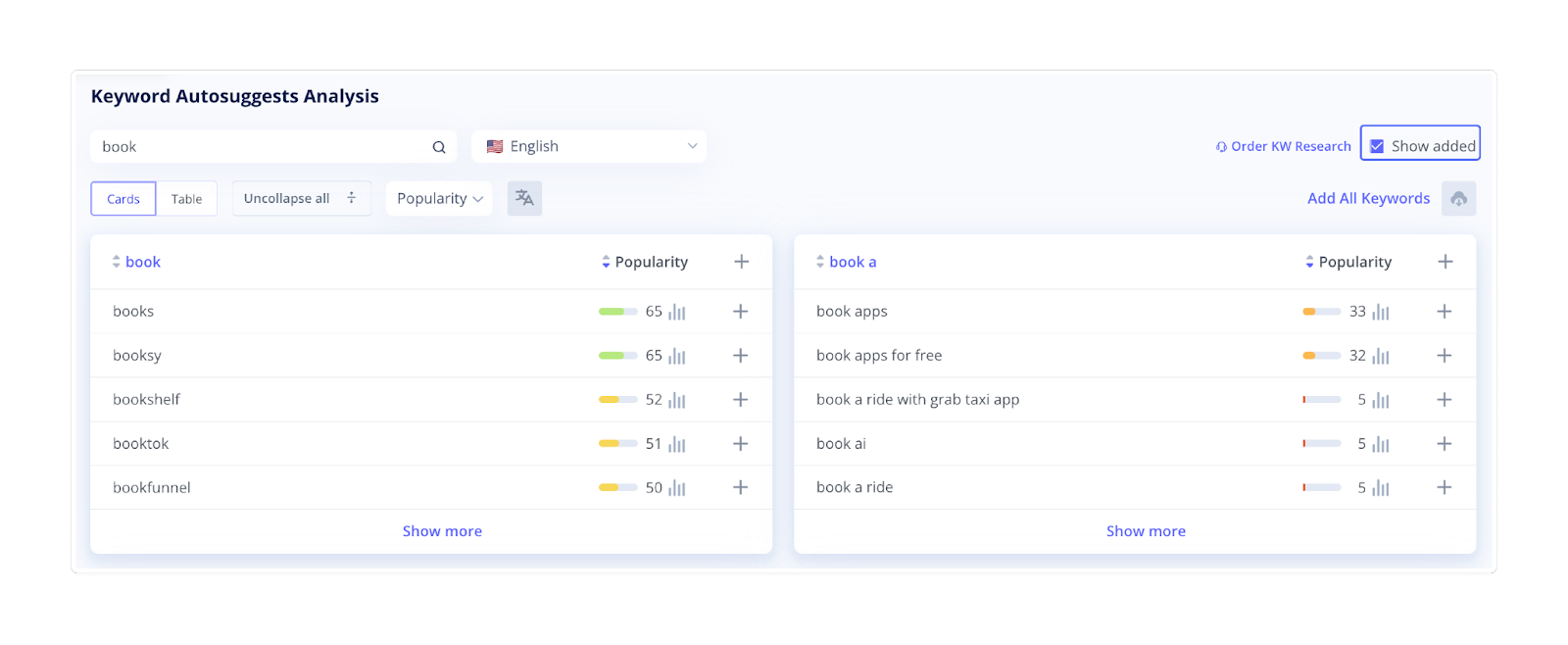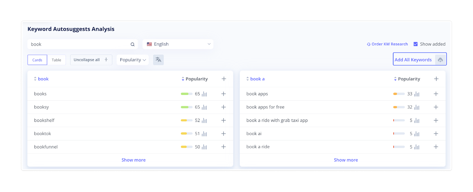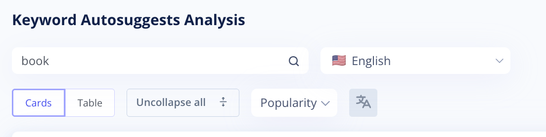 In Card mode, you can expand all blocks by clicking Uncollapse All, or expand them individually using Show More. Also, you can choose a popularity range. Set the parameters manually or pick one of the three preset options.