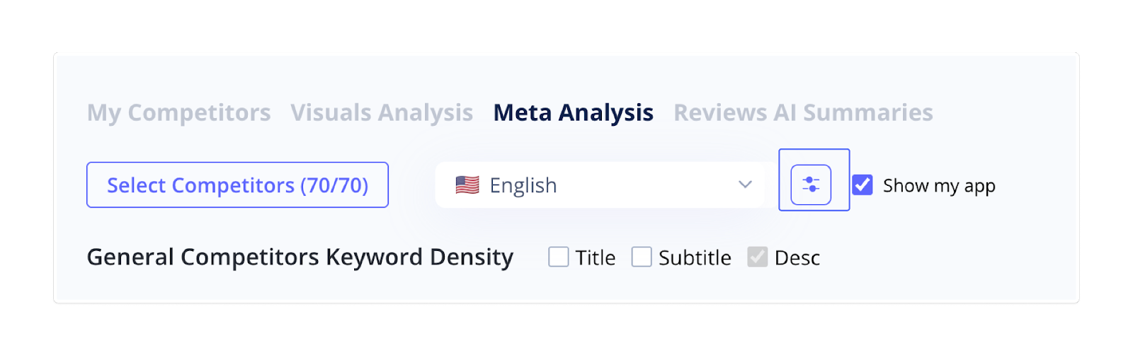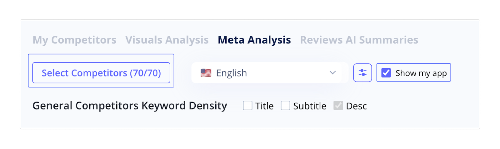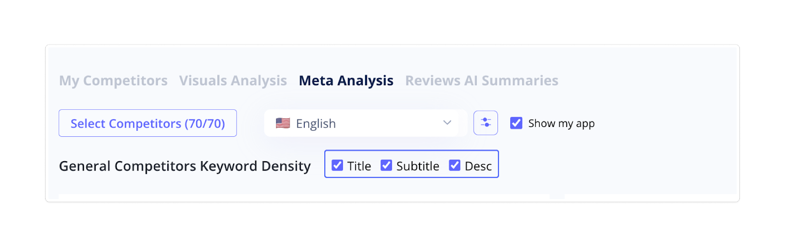The Meta Analysis tool helps you review and compare the metadata of apps you've marked as direct competitors. Here, you can analyze titles, subtitles, short descriptions, full descriptions, and keyword usage to see how top apps position themselves and which semantic patterns improve visibility.
