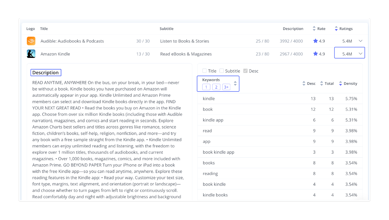 Rating score & total ratingsClick the arrow at the right end of each row to view the competitor's full description and extracted keywords. This helps you quickly evaluate how they structure their metadata and which keywords they prioritize.