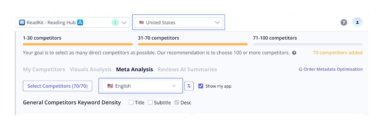 Select the locale and language you want to analyze. This helps you check whether competitors localize their metadata and how their messaging changes across different markets.