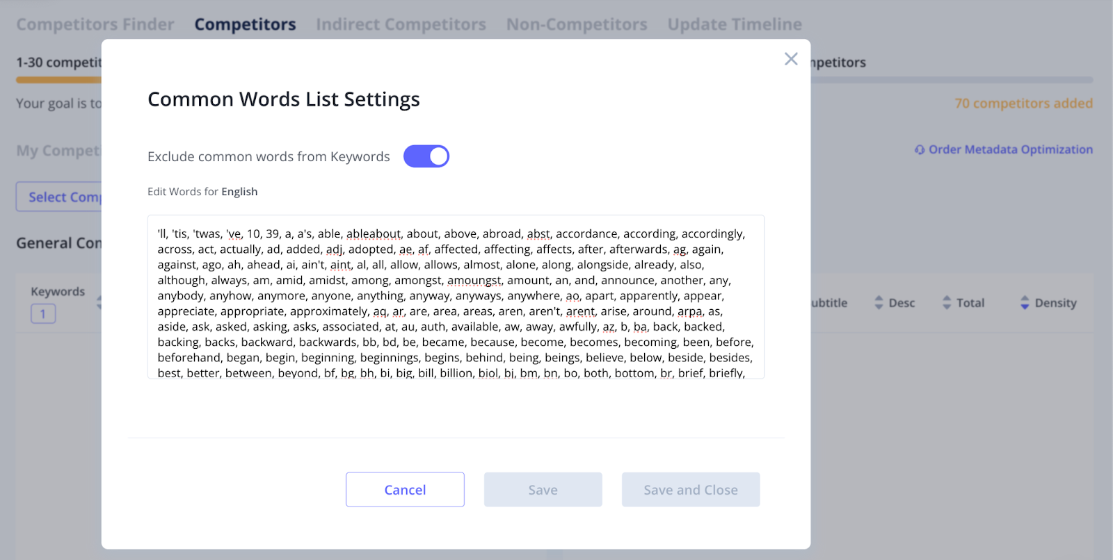 Use the Common Words Exclusion option to filter out high-frequency "stop words" (e.g., and, the, to, for). When enabled, the keyword list becomes cleaner and easier to scan Pro Tip: You can review and edit the list for each language to fine-tune your analysis.