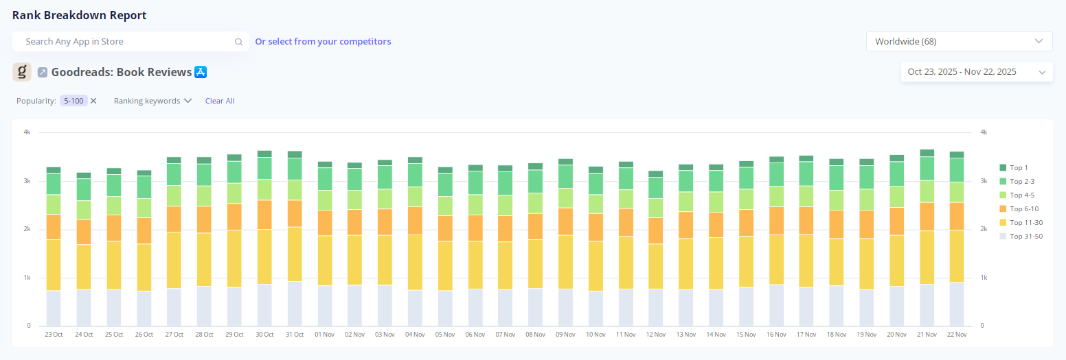 This report demonstrates how keyword counts vary in different ranking positions every day. With these details, you can make metrics-driven adjustments to your ASO strategy.