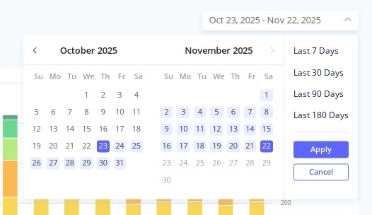 Below the country dropdown, you'll find the calendar. Here, you can indicate the period you want to study. Choose among the presets (like, last 7, 30, 90, 180 days) or set a custom range.