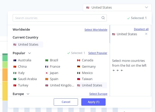 Open the country dropdown in the upper-right corner and choose the market you want to analyze. You may pick any country, region, or view worldwide information.