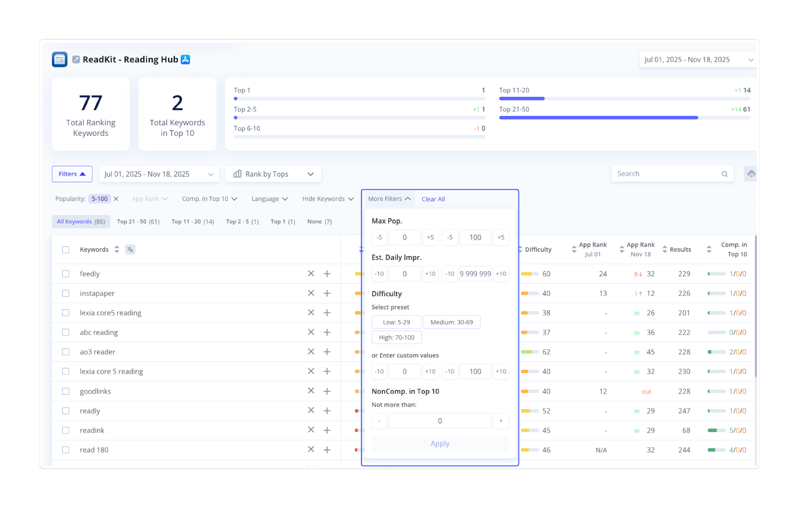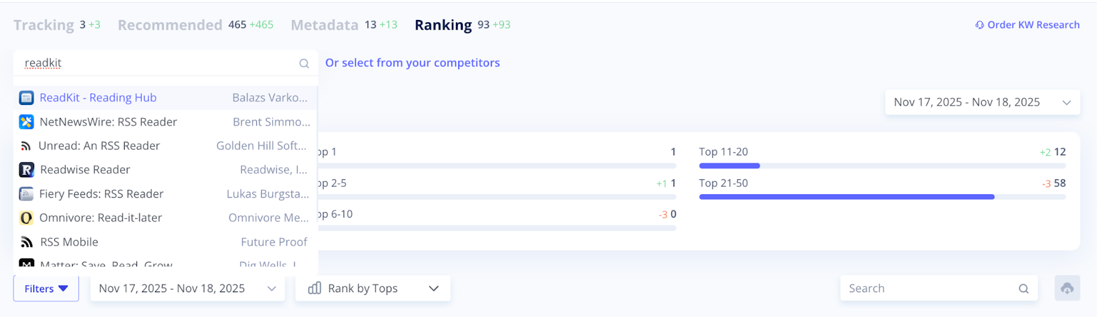 Use the Ranking tool to understand how visible an app is in search and how its keyword positions change over time. This information helps you assess the effectiveness of your keyword strategy and make data-driven decisions when optimizing app metadata.