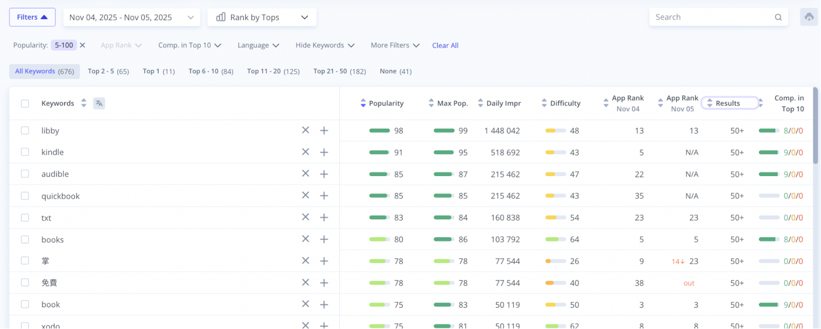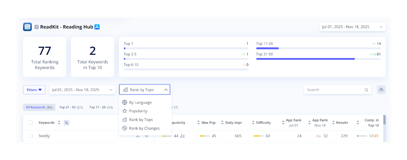 - Rank by Tops – organize keywords according to the analyzed app's position in the search results.