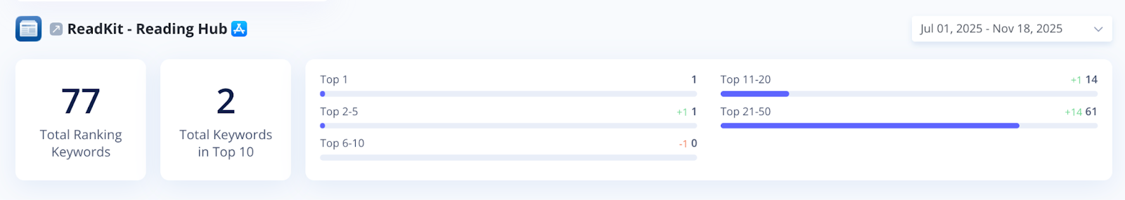 The Ranking tool displays the list of keywords for which a selected app ranks over a chosen period. You can analyze any app (your own or a competitor's) to evaluate how effectively it performs in search results. The tool helps you identify which keywords contribute to higher rankings and which ones are less effective.