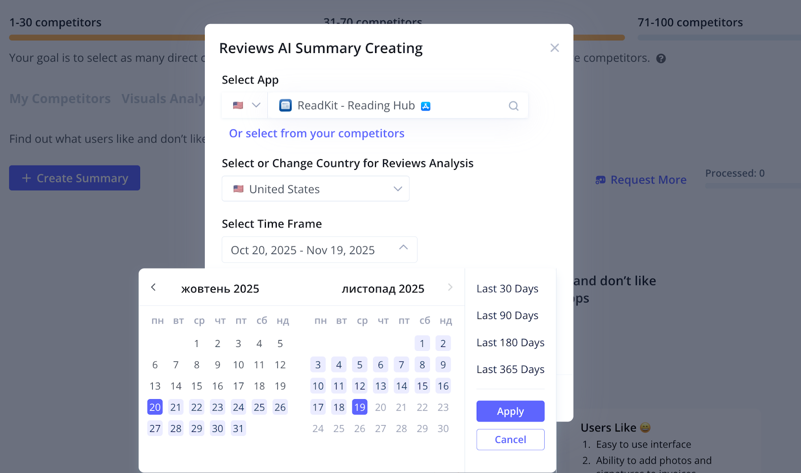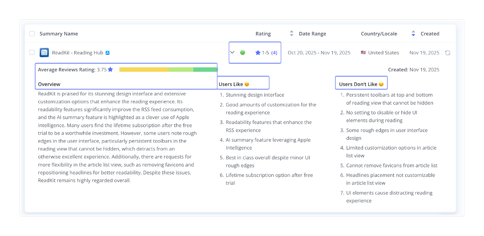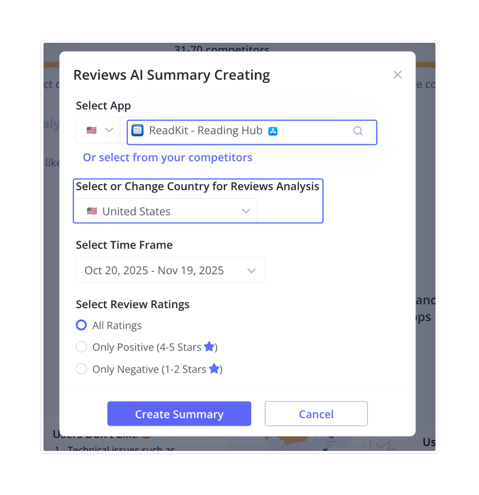 On the App Store, reviews are organized by country. On Google Play, feedback is grouped by locale (user language). This affects how platforms store and display reviews and helps you analyze cultural nuances.Note: Regardless of the language selected, the generated analysis will always be in English.