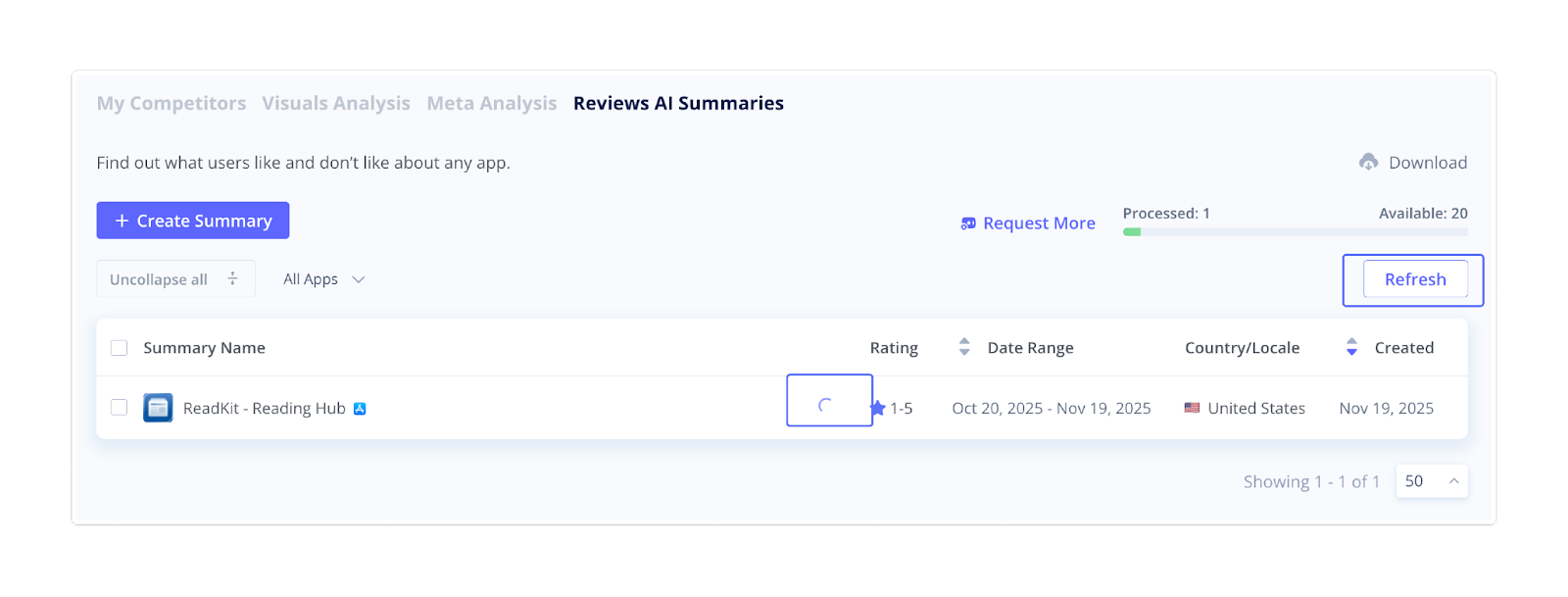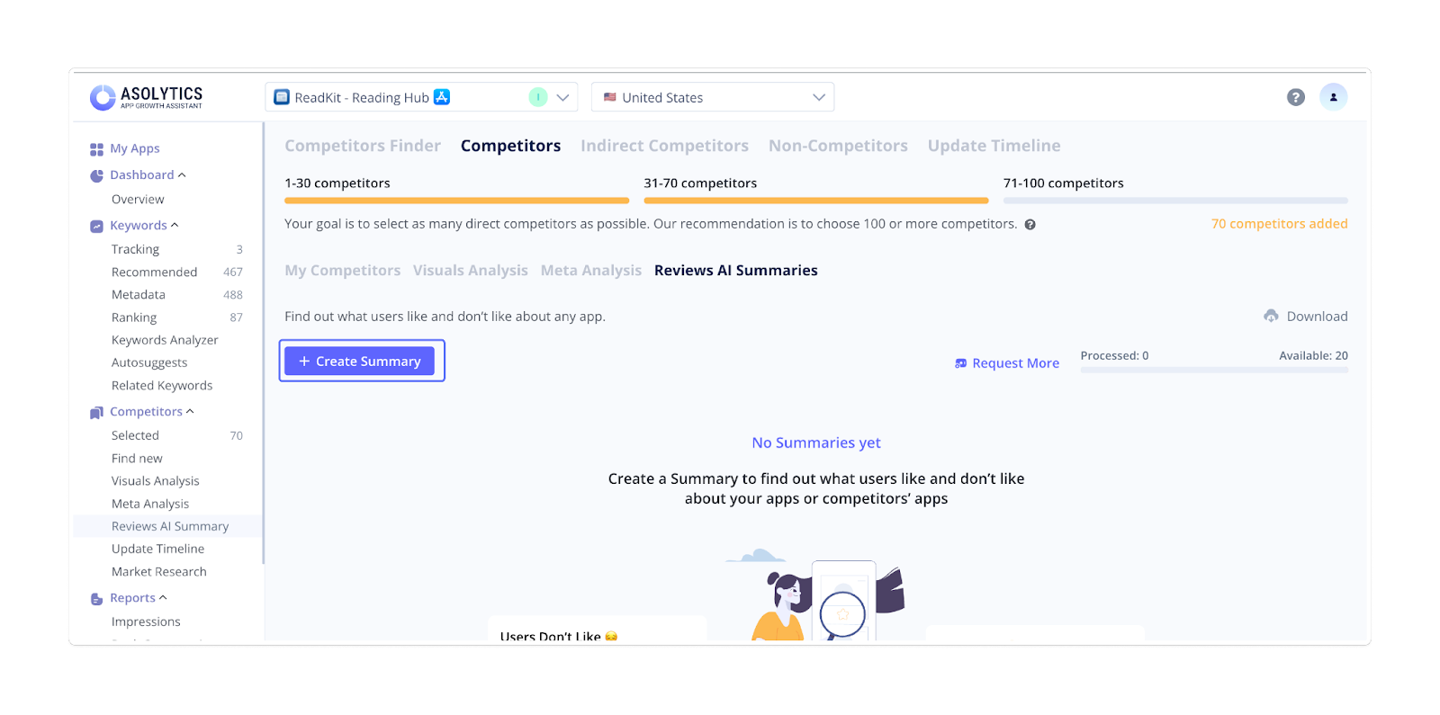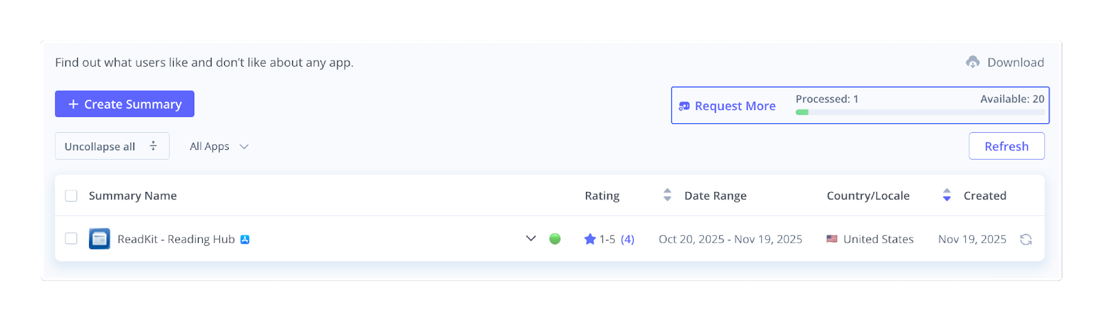 Use the Reviews AI Summary tool to save hours of manual review reading and extract actionable tips in seconds. Understanding what users value most helps you optimize your product and outperform competitors.