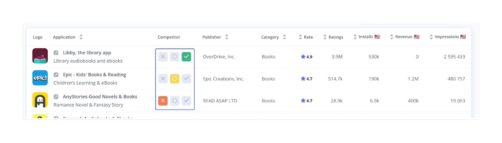 Use the sorting arrows in the table headers to reorder by installs, rating, revenue, or impressions to identify top performers and emerging threats. 4. Export Your Results