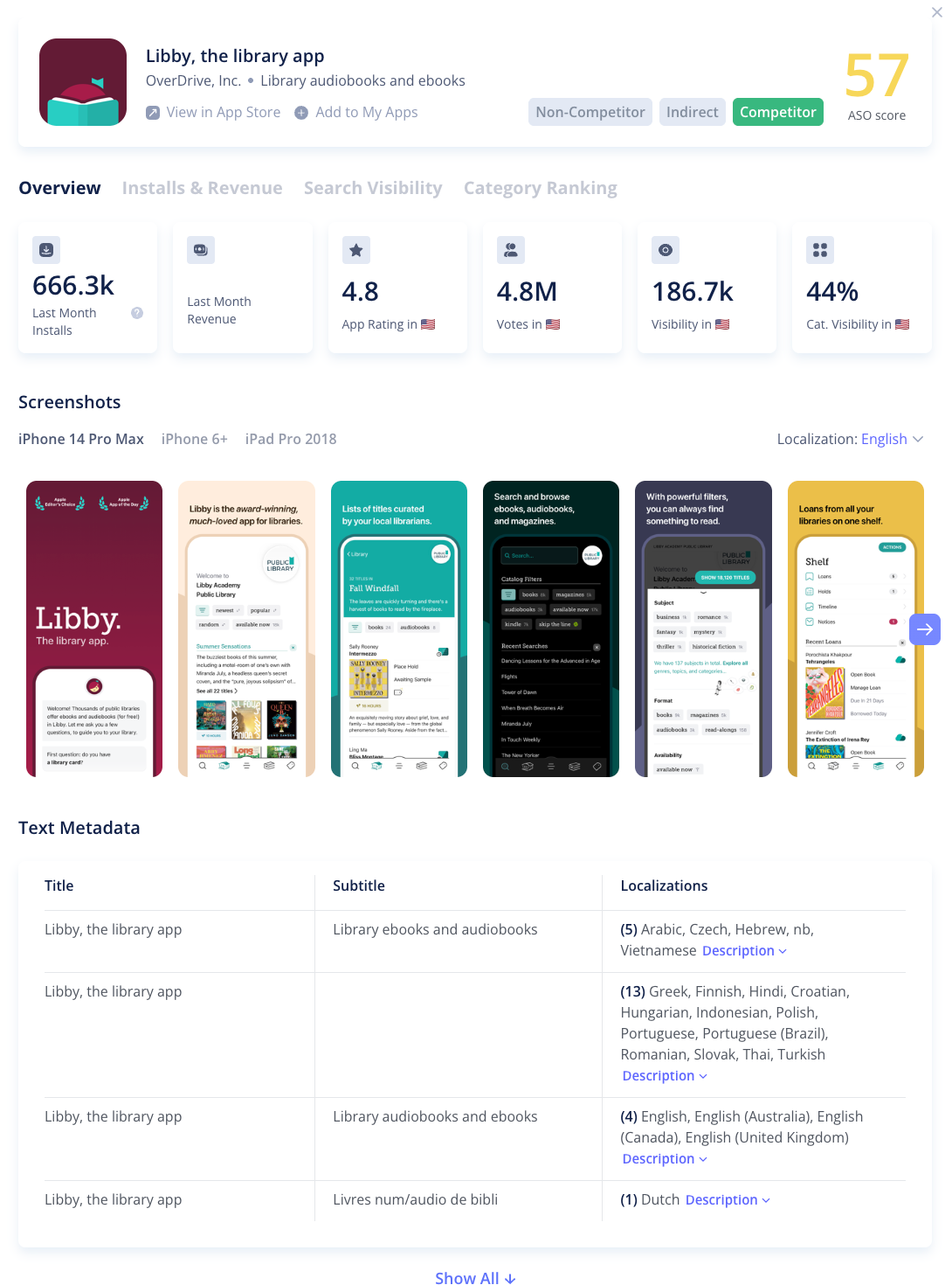 To get detailed information on each app, click its name or logo. In the pop-up window, you can review the app's ASO score, metadata, device screenshots, installs, revenue, search visibility, and category ranking.