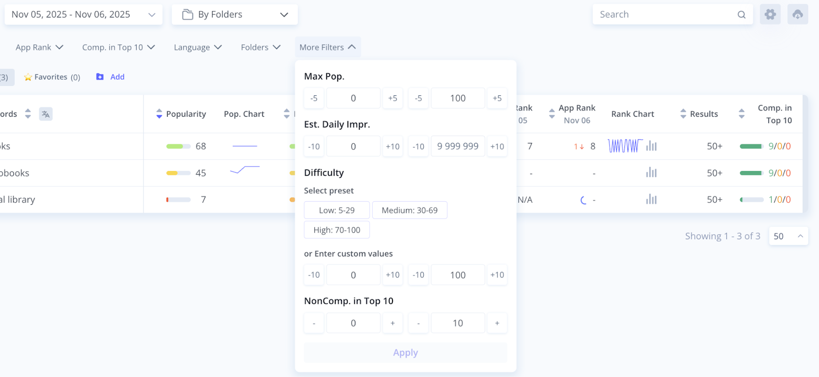 Adjusting date ranges and sorting options helps you monitor ranking progress and focus on areas where your app gained or lost visibility.