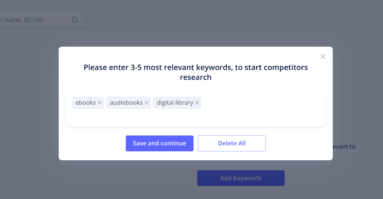 To start working with the tool, click Add Keywords. Type or paste your keywords into the pop-up window that appears. If you're adding multiple keywords, separate them with commas.