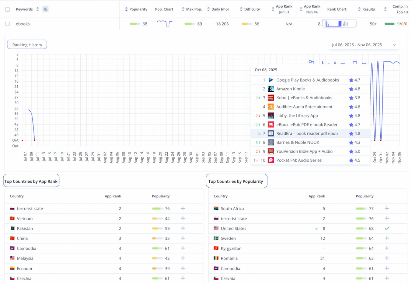 This metric helps you quickly assess how your app's visibility changes over time for each tracked keyword.