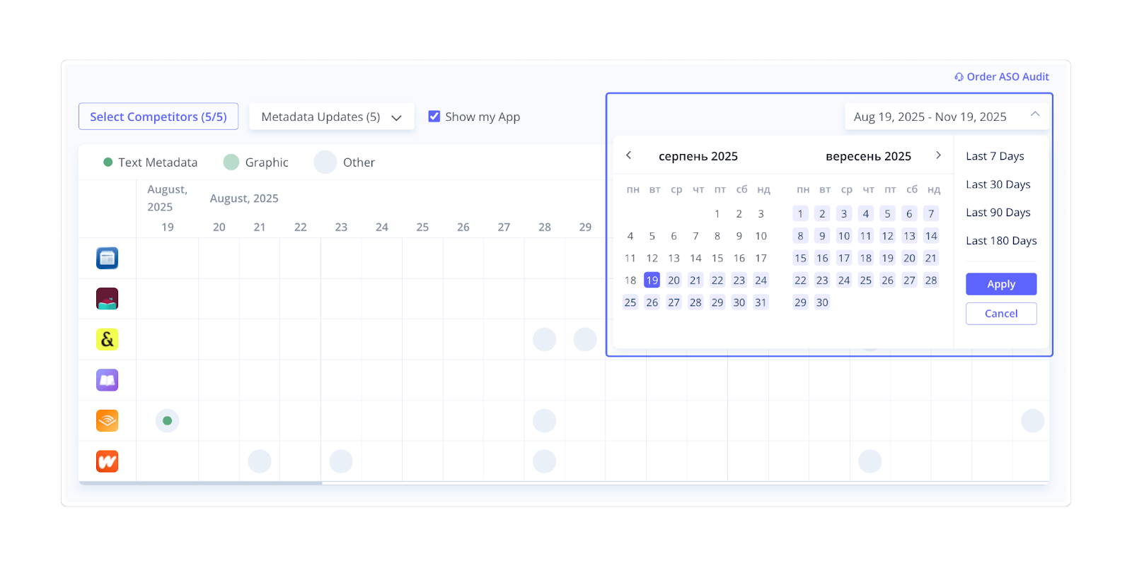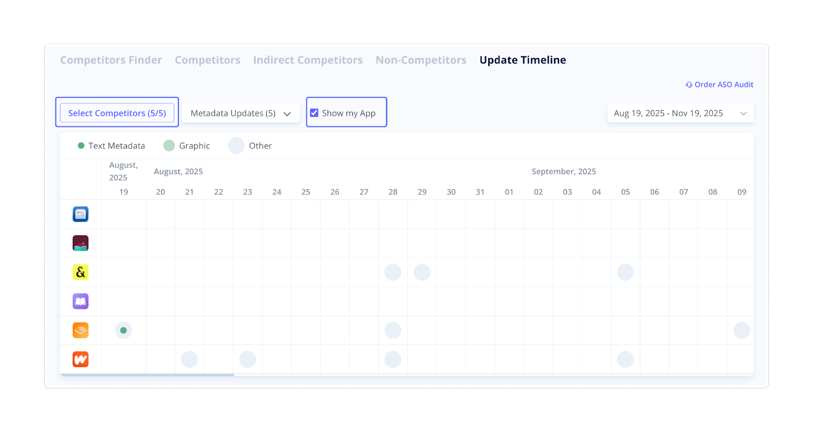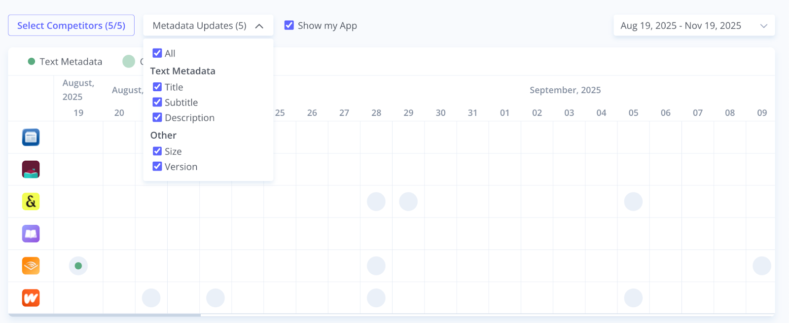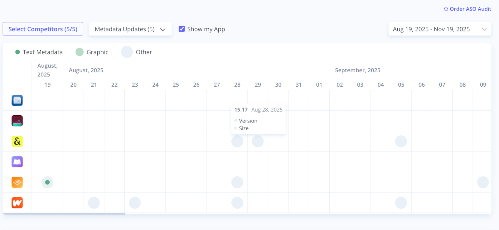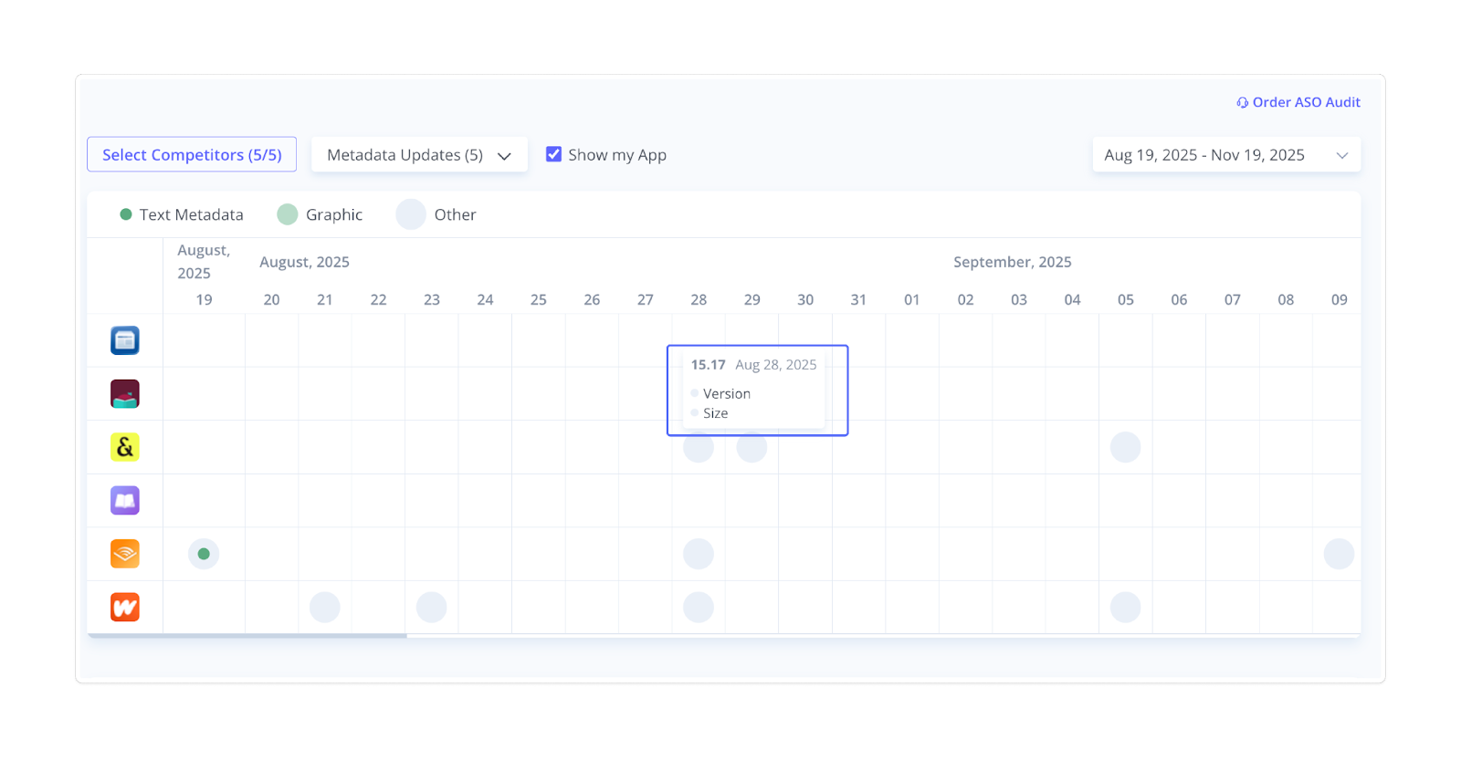 The Update Timeline tool shows how your and your competitors' apps have evolved over time. It collects upgrade history and optimization changes to help you understand what developers modified in the product or on its app store page.