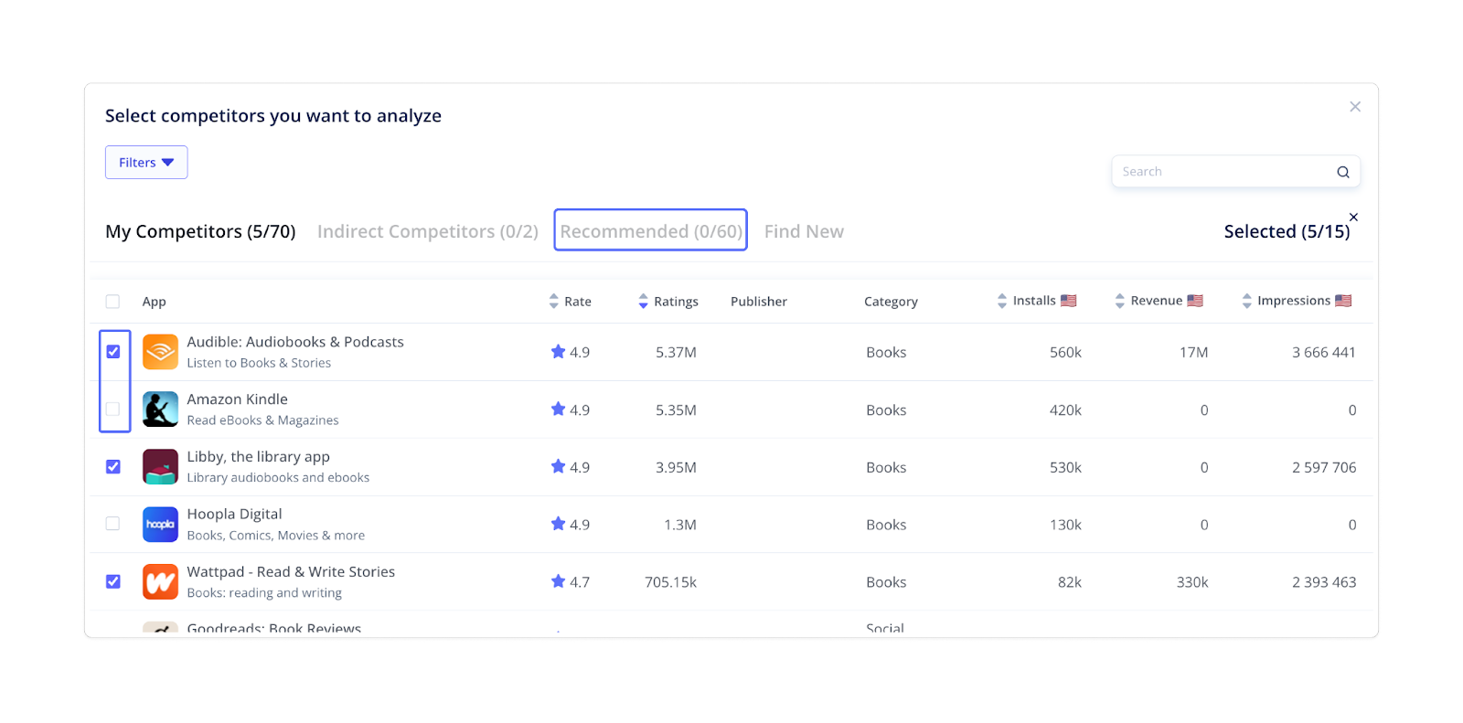 Click Select Competitors to choose the exact apps you want to monitor. If you want to include your own app, tick Show my App.