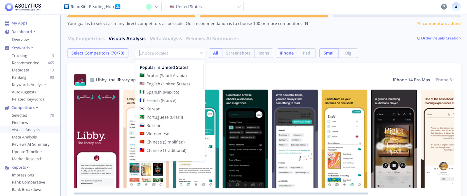 The Visual Analysis tool displays the screenshots and icons of the apps you've marked as your direct competitors. Here, you can review and compare competitor visuals to understand creative trends and see how top apps attract user attention.