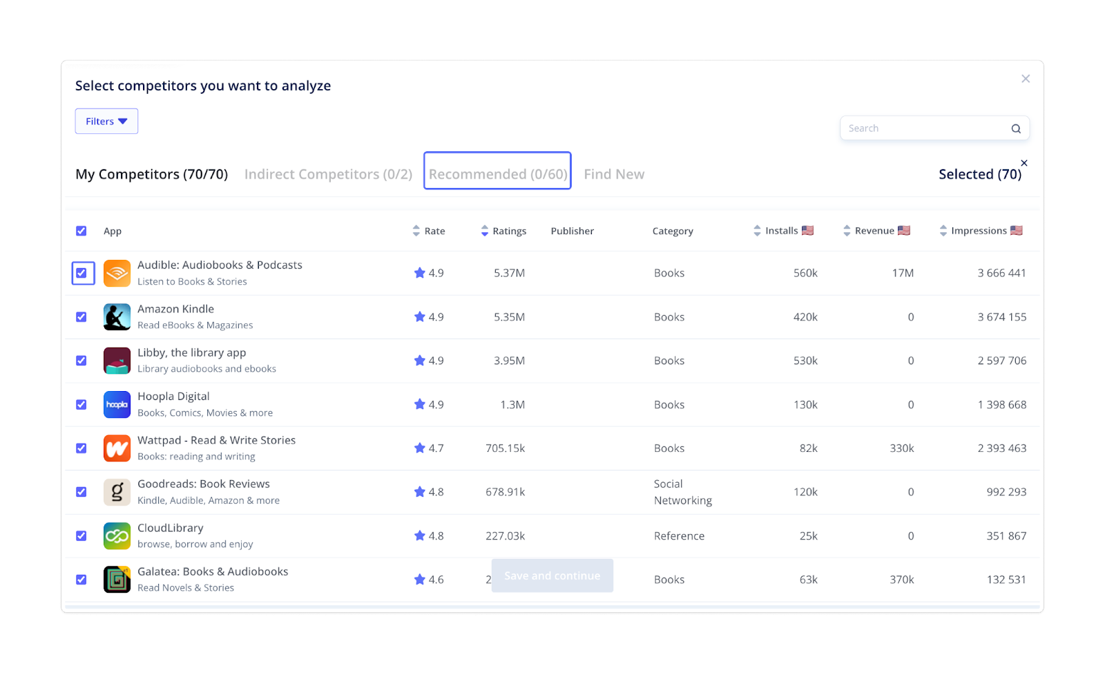 By default, the tool displays all apps you've marked as direct competitors. If you want to narrow your focus, use the selection button to choose only the apps you're currently interested in. You can also add more competitors from the Recommended section to broaden your comparison.