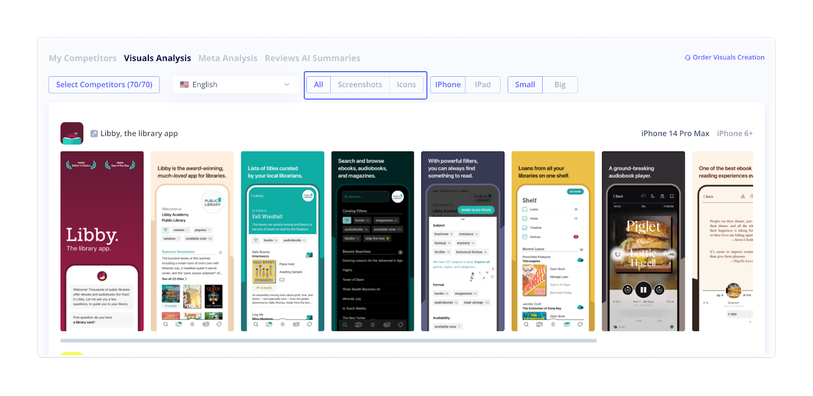 The tool allows you to analyze screenshots and icons together to see how competitors structure their creative sets. You can also review them separately if you want to focus on one specific type.