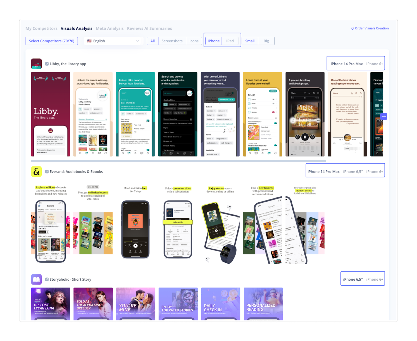 If you're analyzing an App Store app, the tool also lets you switch between visuals for different devices. In some cases, you can compare screenshots across specific iPhone or iPad models to see how competitors adapt their creatives for various screen sizes.